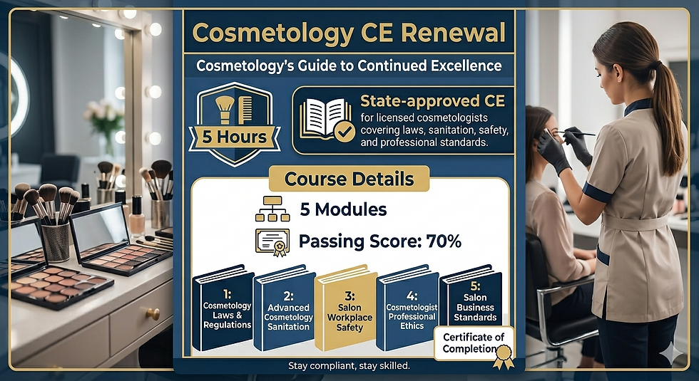 Complete your cosmetology CE requirements online with state-approved training modules.